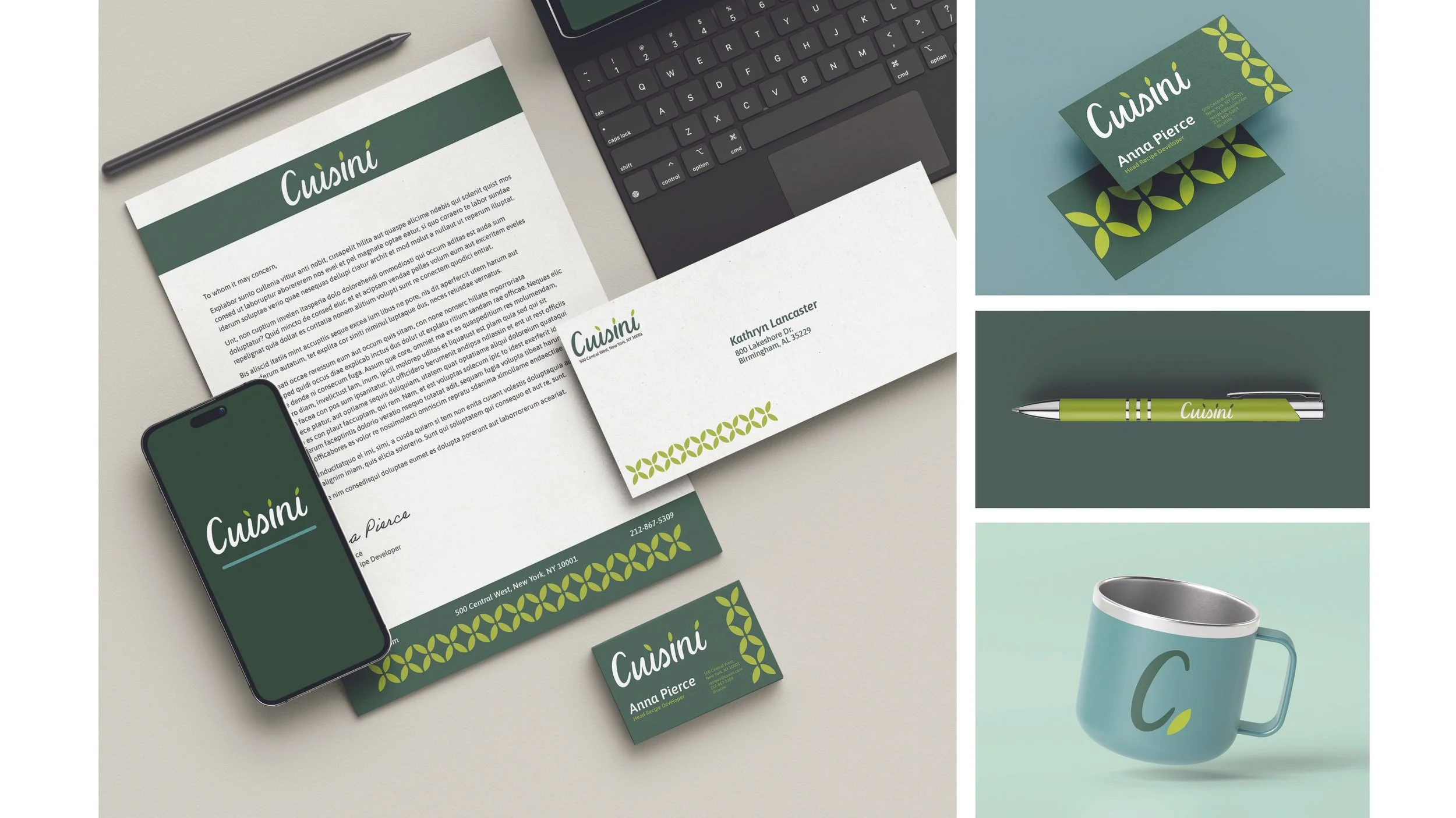 This project was designed as a Branding class assignment, each student was assigned a fictional business and short description. We not only designed detailed brand guides, but also applied these designs to stationary and merchandise. Cusini provides around-the-clock culinary advice to home cooks and event planners through their convenient app and website. Their team of chefs answer questions about cooking techniques, ingredients, and recipe preparation through both prerecorded videos and a live chat feature. With knowledgeable staff on call, they are available to help with anything from a special event to a simple meal. This service gives dependable and prompt assistance to help all customers gain confidence in the kitchen. Their online presence is simple, efficient, and approachable for users so that they can prioritize enjoying a meal with their loved ones. The brand colors and leaf imagery represents growing skills with Cuisini.